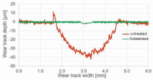Ball-on-disc wear test. An aluminium oxide ball, Ø 5 mm, was pressed against the cylindrical surface of a rotating disc at a force of 20 N. While under pressure, the disc was rotated at a speed of approximately 50 mm/s. The rotation lasted for just over 2.5 hours giving a continuous wear track of 500 m across the disc. This was performed on untreated 316L material and 316L with Kolsterising® applied. Once testing was complete the samples were measured tactilely using a profilometer. The surface profiles of the two samples is shown in Figure 10. A high wear volume is indicated for the untreated sample, while the Kolsterised sample shows just a certain embedding at the surface.