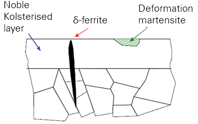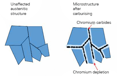 Typically, in conventional carburising or nitriding, chromium carbides or nitrides are formed at the grain boundaries due to high process temperatures (>500 ºC). This leads to chromium depletion and loss of corrosion resistance, see figure 1.