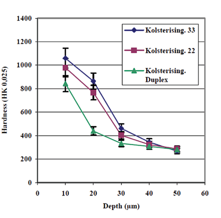 Surface hardness is of prime importance in increasing resistance to wear and galling. There are three ‘normal’ Kolsterising® treatments, 33 micron, 22 micron and duplex. The ‘33’ and ‘22’ refer to the nominal case depth in microns. A special treatment is necessary for duplex alloys, as there is a risk of embrittlement at high treatment temperatures.