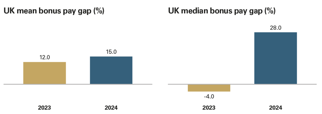 The percentage of males and females receiving a bonus remained unchanged between 2023 and 2024. The bonus pay gap changes between 2023 and 2024 were largely influenced by several leadership changes that resulted in some of these roles moving between the UK and other countries in which we operate.