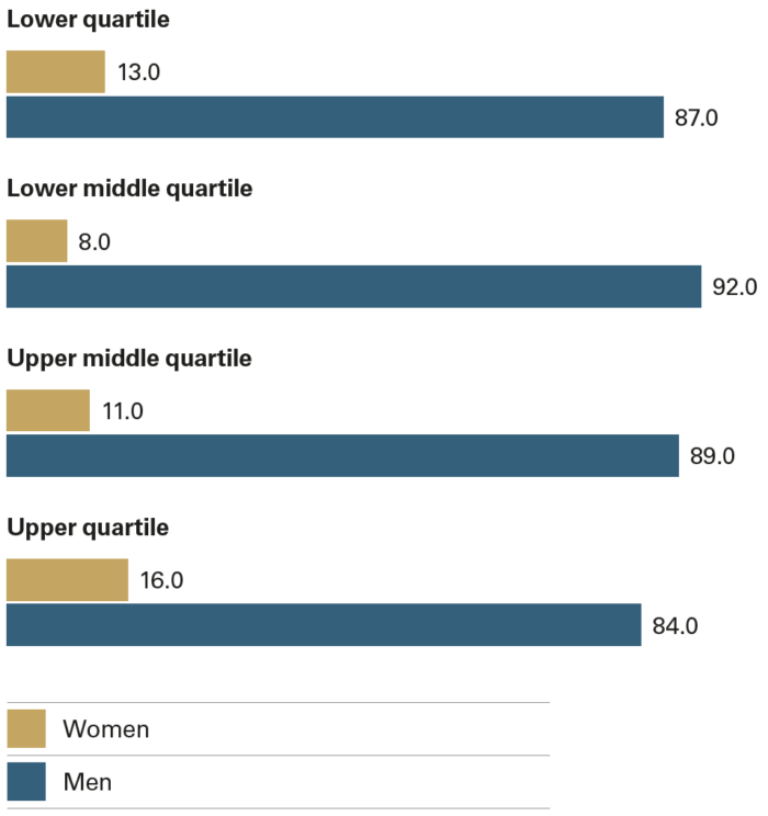 Across the UK, women are more represented in the upper pay quartiles which is driving the negative gender pay gap.
