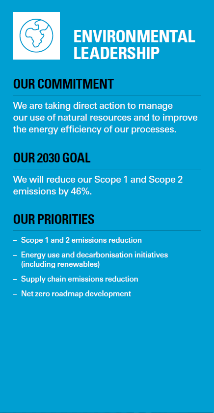 In 2024, we launched new environmental leadership targets, including a 46% reduction in our Scope 1 and 2 greenhouse gas emissions by 2030, enabling customers to avoid 125,000 tonnes of CO2e, and increasing revenue from sustainable applications to 20% by 2035. Additionally, we established robust Scope 3 emissions reduction goals, targeting a 45% reduction in fuel and energy-related emissions and for 30% of our suppliers to have set their own carbon reduction targets by 2030. Read more about our decarbonisation focus.