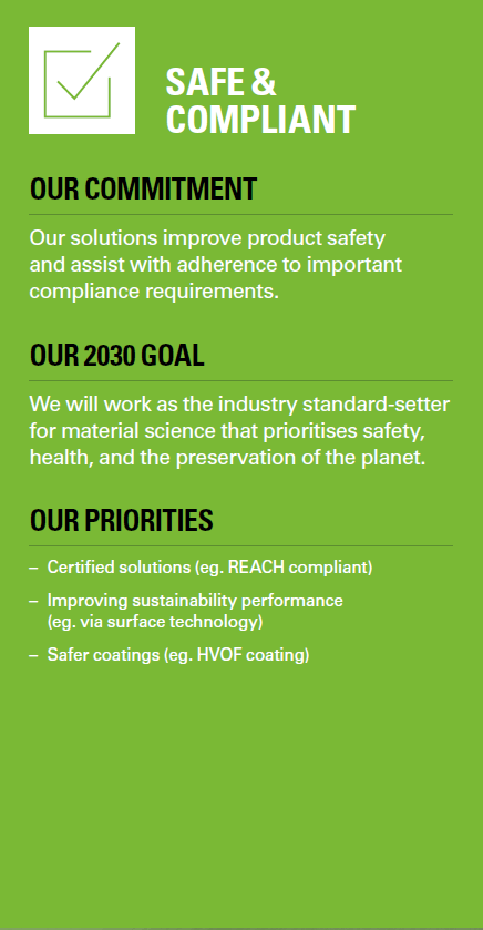As a leader in materials science, we are committed to setting the standard for safe, responsible and sustainable thermal processing. Our specialist technologies enhance product safety and support compliance with established and emerging health, environmental, and industry regulations.